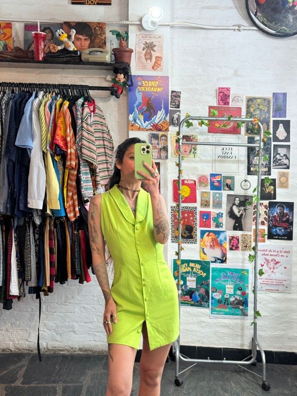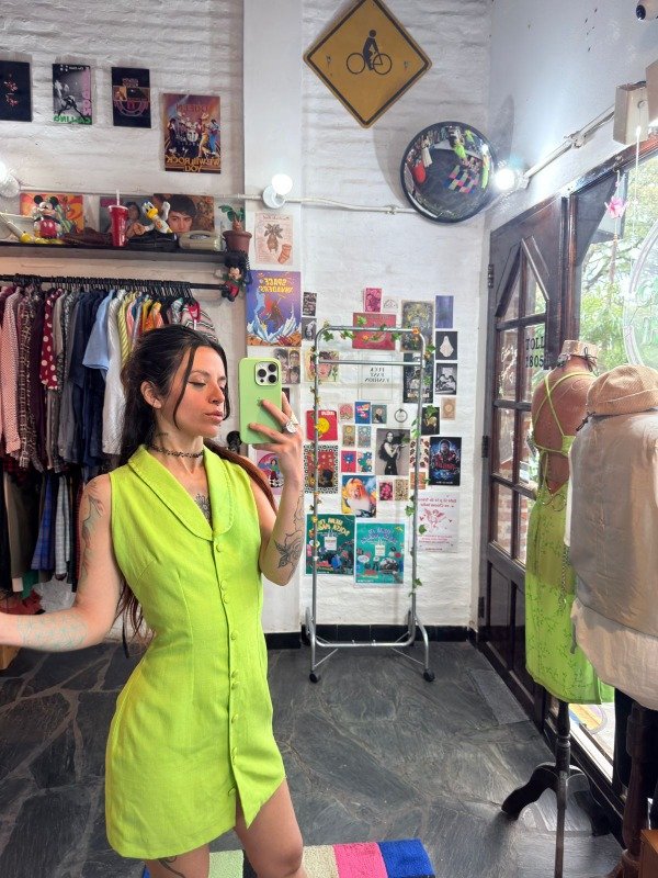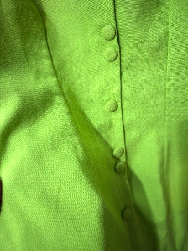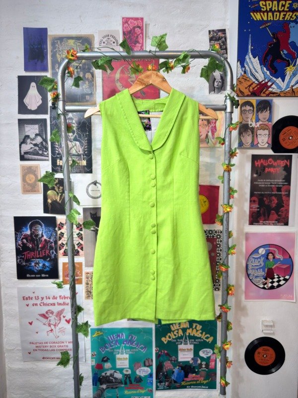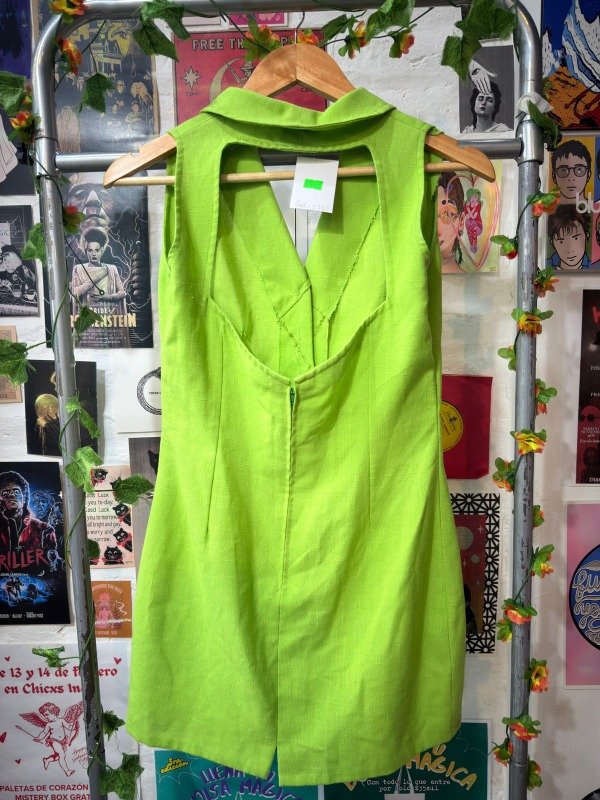 Tiene botones que son falsos, parte del diseño, atrás tiene la espalda alta descubierta y debajo un cierre